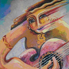 "The mother’s feelings are the most beautiful expression of love. There is a child, naked and waiting of a word of hope. Behind him are steps and an open door that lets sun light to come in to illuminate, this means freedom. On the right there is a woman, also naked, without selfishness, sure of herself; her expression is love, in the elasticity of her body we see with clarity the liberty of her feelings. The rainbow of colors is reinforcing the beauty of the pure feeling between mother and son. The relation- ship between human being and music in the middle of the natural environment , the expression of his eyes is turning into the context around, the shows the pass of the years, a guitar with different curves, declaring the movement and rhythm of songs that comes from the heart. His hair follows the vibrations of the strings and makes possible the sense of the human symphony."