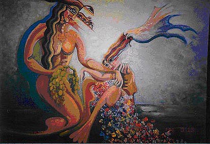 "The mother’s feelings are the most beautiful expression of love. There is a child, naked and waiting of a word of hope. Behind him are steps and an open door that lets sun light to come in to illuminate, this means freedom. On the right there is a woman, also naked, without selfishness, sure of herself; her expression is love, in the elasticity of her body we see with clarity the liberty of her feelings. The rainbow of colors is reinforcing the beauty of the pure feeling between mother and son. The relation- ship between human being and music in the middle of the natural environment , the expression of his eyes is turning into the context around, the shows the pass of the years, a guitar with different curves, declaring the movement and rhythm of songs that comes from the heart. His hair follows the vibrations of the strings and makes possible the sense of the human symphony."
